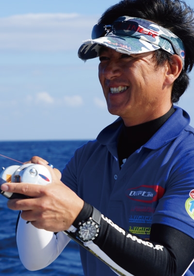 静岡を拠点に活動範囲は日本全域。間違いなくスーパーディープジギングのトップランナーのひとりであり、現在も新たなターゲットやフィールドの開拓に余念がない。最近は深海魚のジギングだけでなく、エサにしか反応しなくなった大型のマグロなどの回遊魚をスローピッチで狙う、いわゆる「パワースローゲーム」の開拓にも力を入れている。